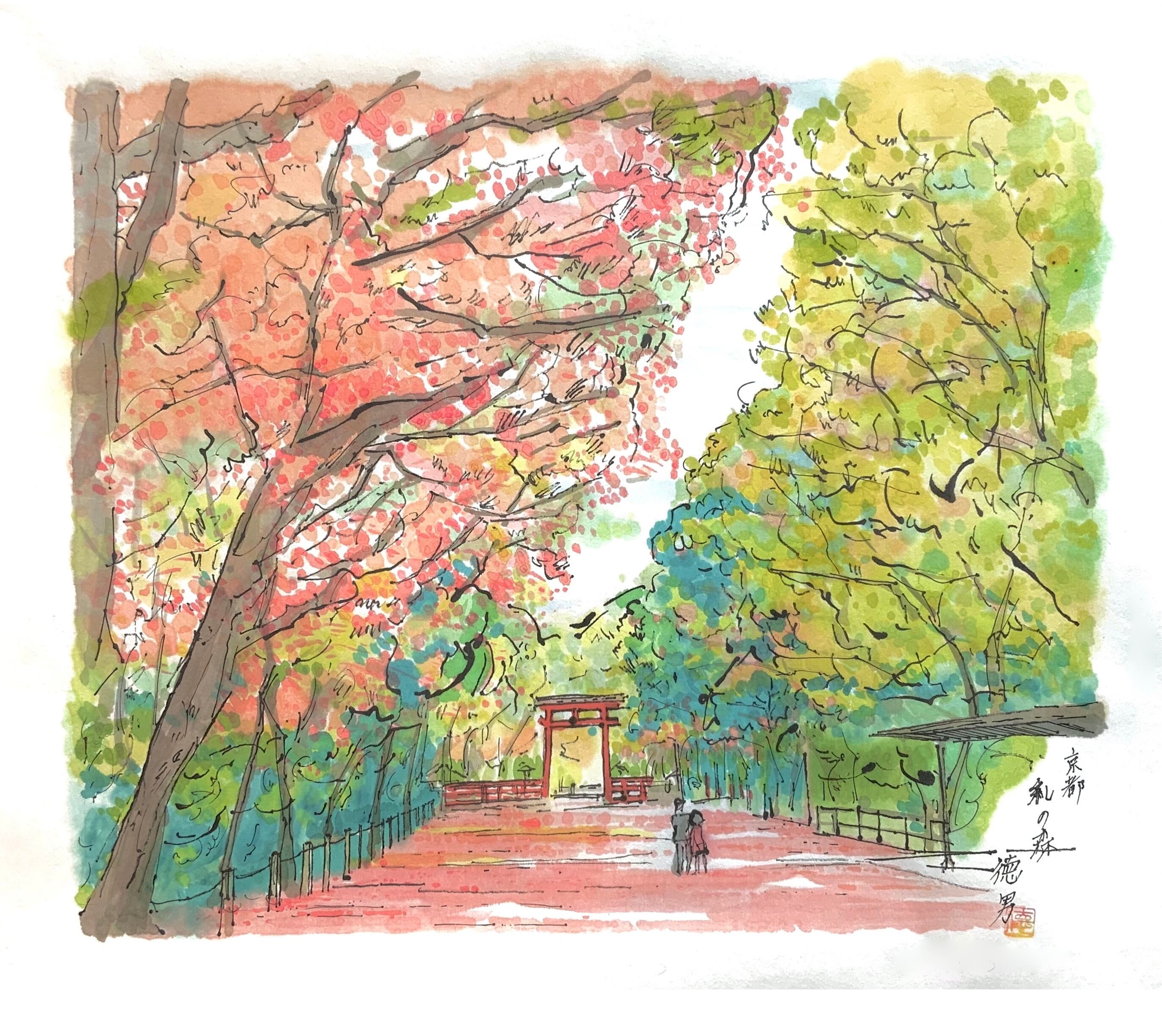 ジグレー版画の魅力を駆使し、深い緑や優雅な色彩で糺の森の息遣いを生き生きと蘇らせています。